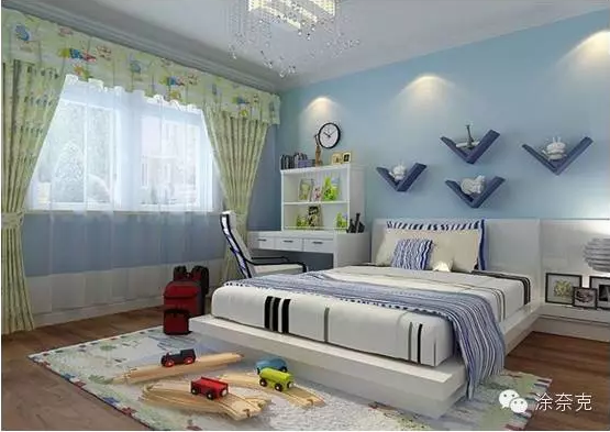 幔纱窗帘随风飘舞,蓝色条纹的床单枕头装点床铺,同款的靠背椅,淡蓝色的温情墙衣墙上,深色个性置物架摆放着各种有趣的小工艺品,地毯上汽车模型、木质轨道错落叠放,表达着业主的自由文艺的个性…… 墙衣墙+软装已经成为人们表达自我的一种有效方式。